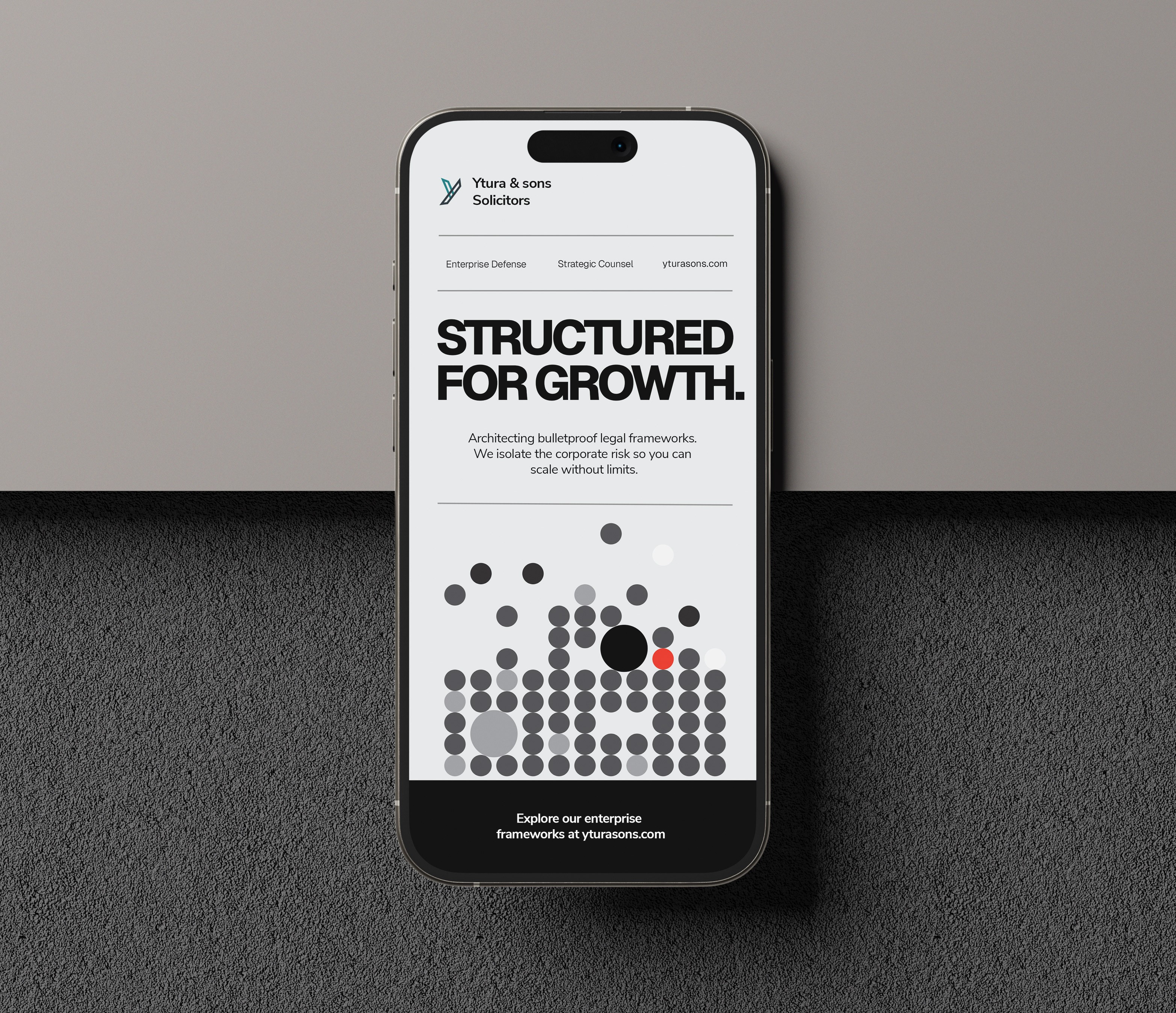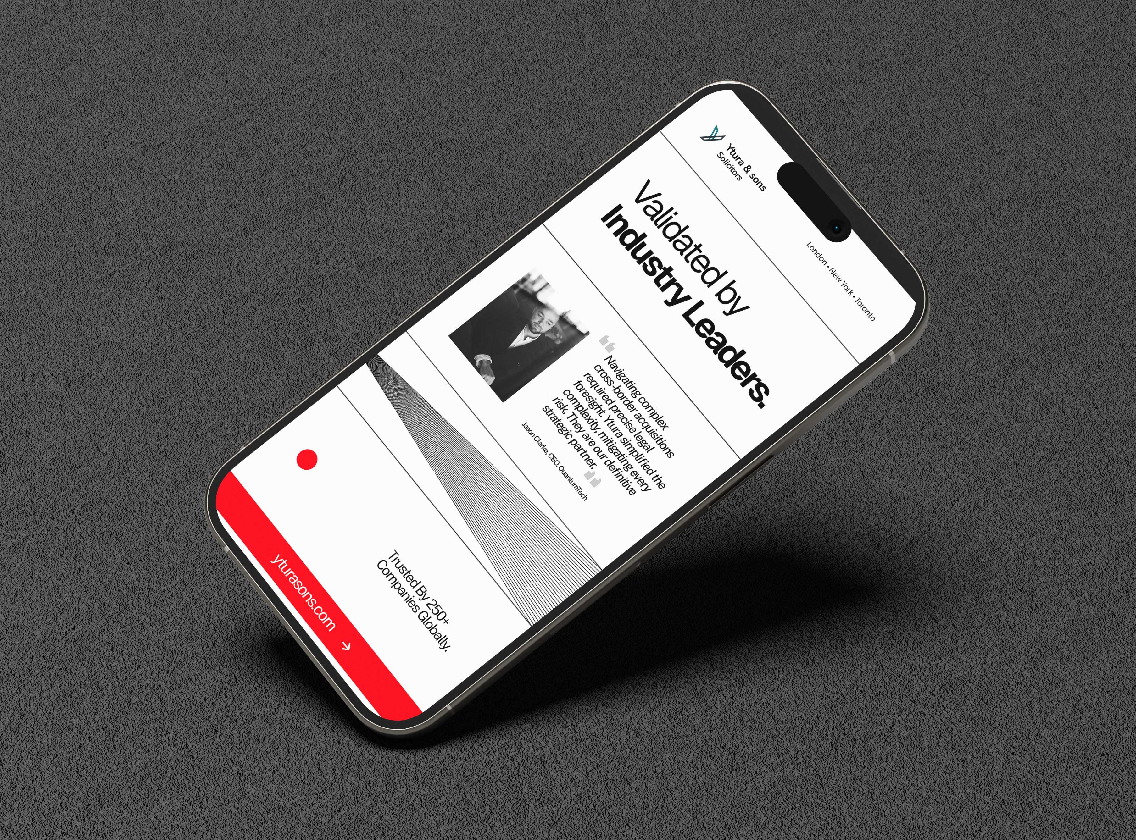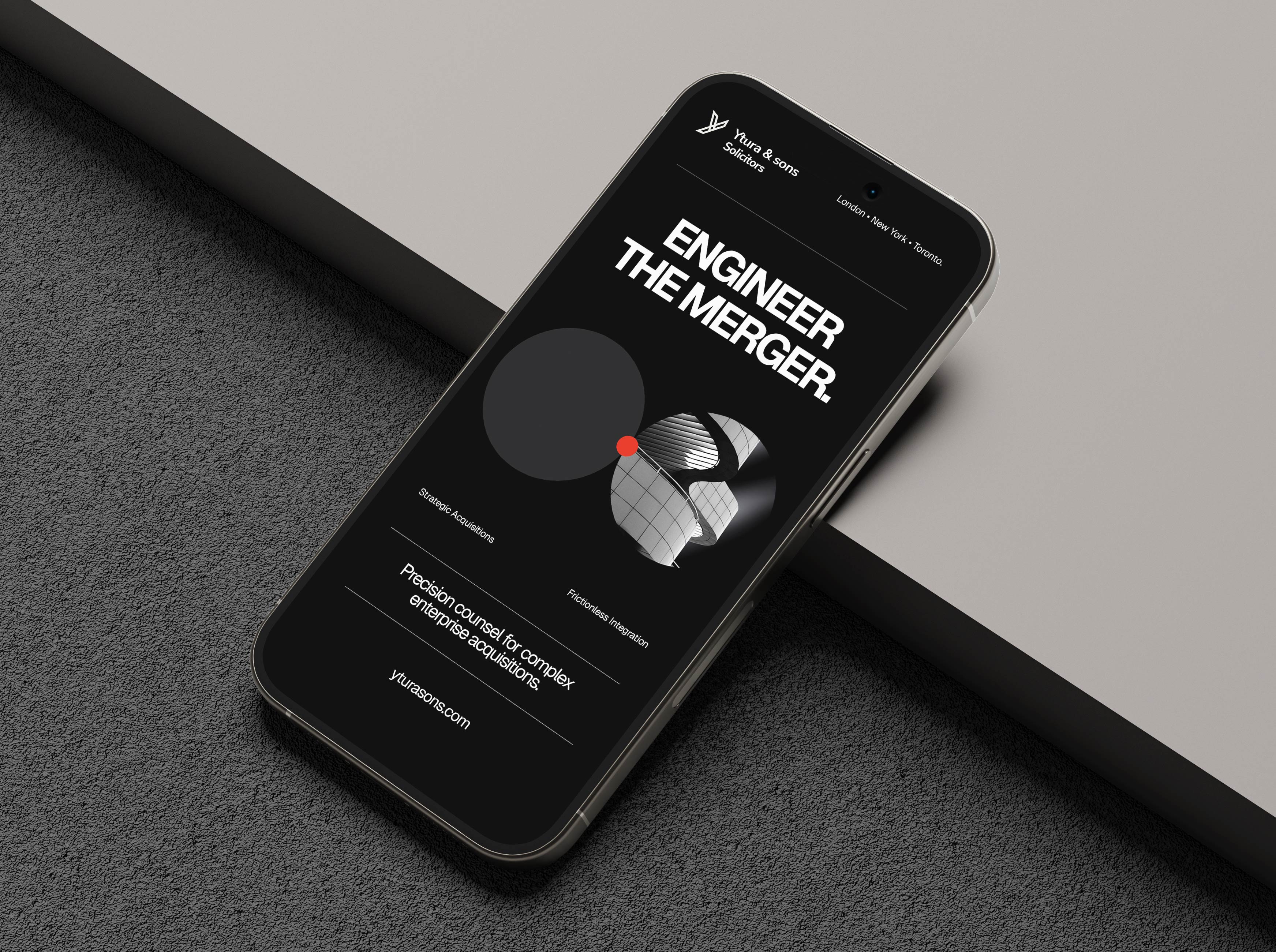 Ytura & Sons needed to shed the traditional "high-street" legal aesthetic to compete for multi-million-pound corporate retainers across London, New York, and Toronto. We engineered a three-part digital ecosystem anchored in Swiss Brutalism and high-end editorial design. By utilising abstract data metaphors, an aggressive dark-mode M&A campaign, and stark, authoritative typography, we positioned the firm as an exclusive, untouchable consulting powerhouse. The recurring "Red Dot" motif visually reinforced their core value: isolating risk and securing the deal in a sea of corporate complexity.